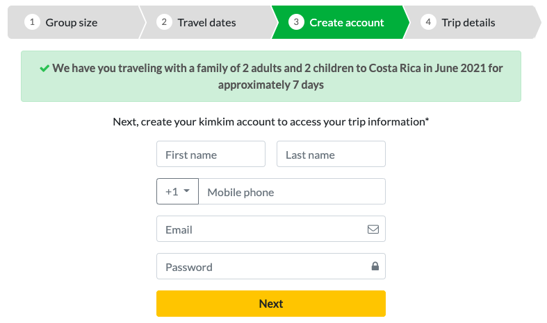 We designed an onboarding questionnaire for users to complete prior to booking their vacations. Using the information that is submitted, a travel agent reaches out shortly afterwards to provide itineraries catered to the user’s goals.