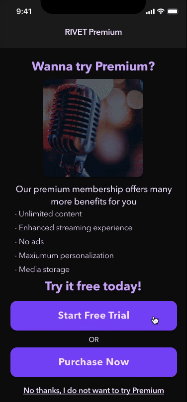 I incorporated the main features of RIVET into steps of the user journey. The user would ideally take these steps to successfully convert their subscription to premium.