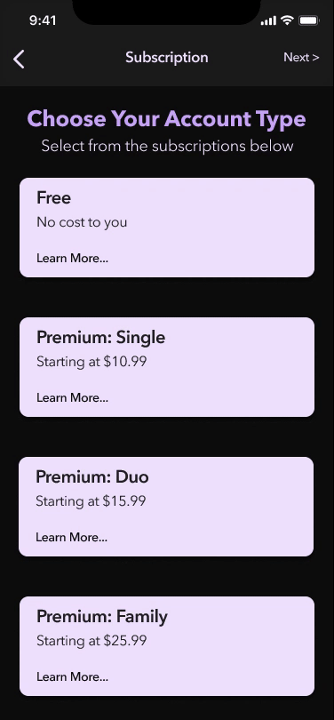 By connecting the screens into a flow, I turned the wireframes into a low-fidelity prototype. Four participants clicked through as if they were creating an account with a premium membership. Additionally, they had the option to create an account and do a free trial.