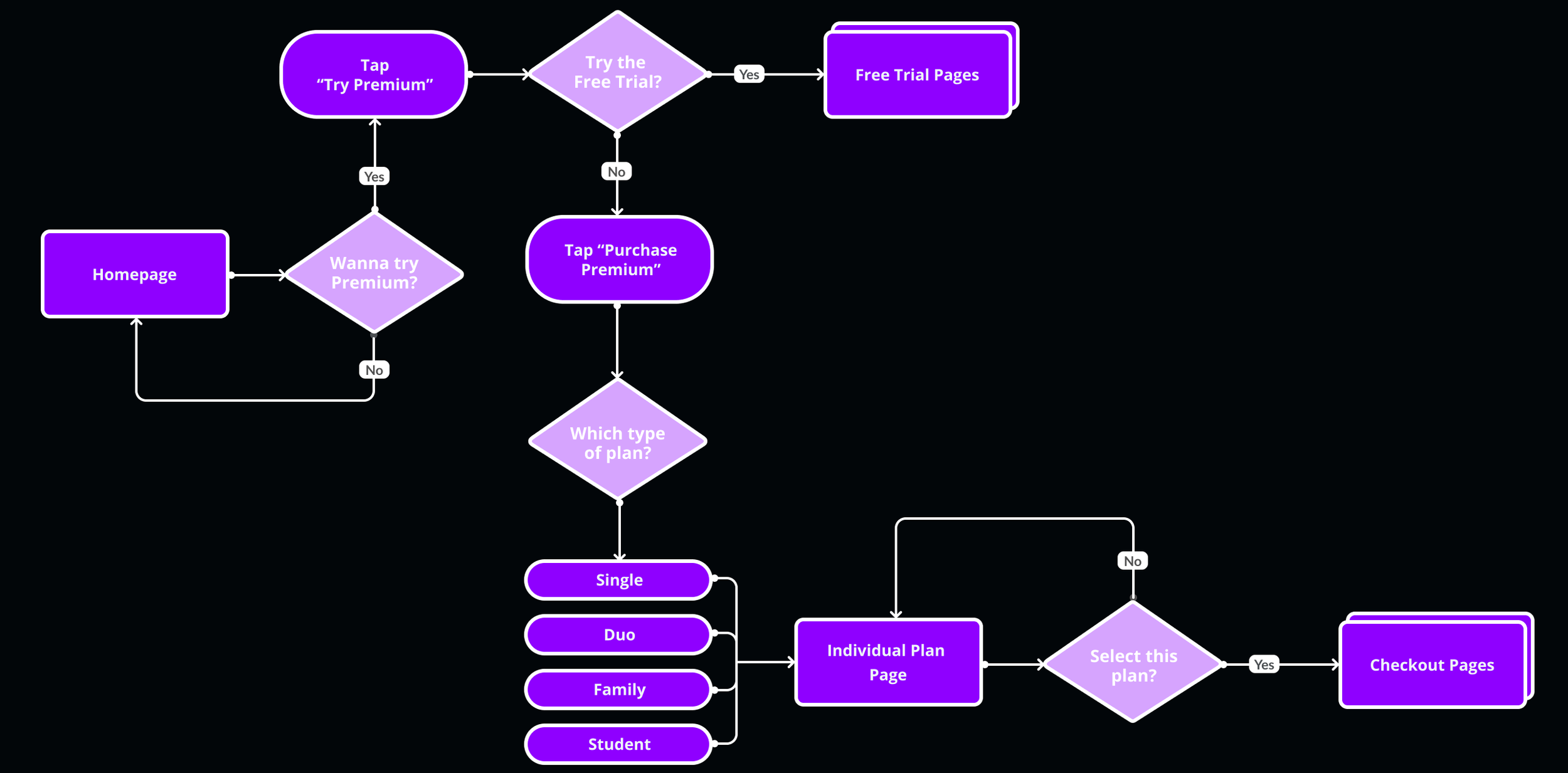 I needed to incorporate the “freemium” model into RIVET. Since I learned how to attract users to premium and increase conversion rates, I mapped out the structure to meet these goals.