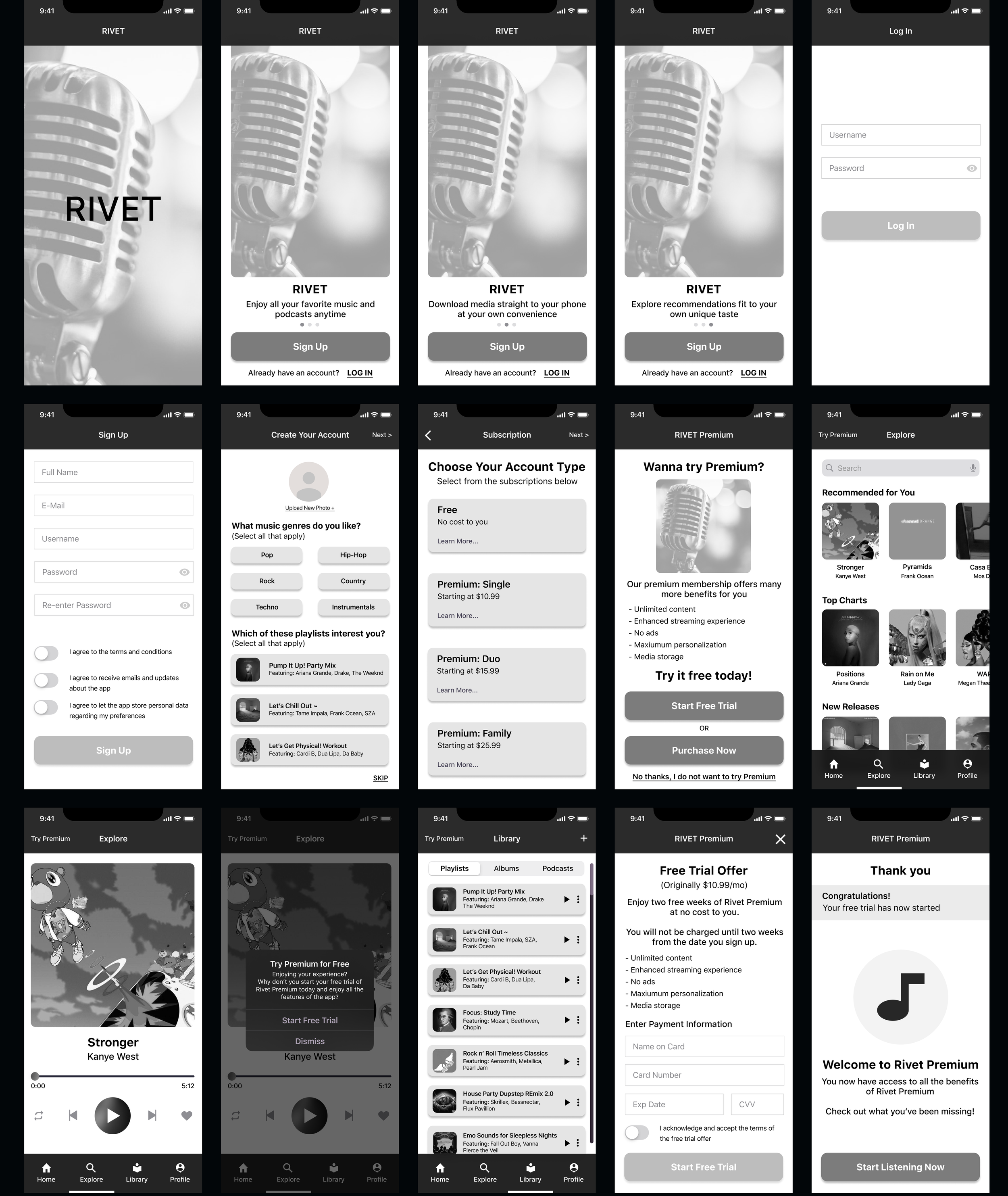 I applied the visual styles from above and turned my wireframes into high-fidelity designs. This is where RIVET really comes to life!